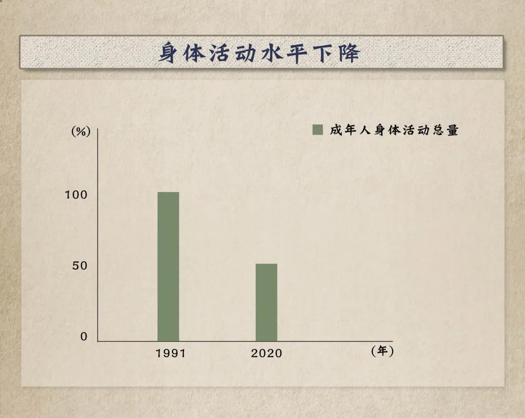 中國(guó)居民總身體活動(dòng)量與心血管病死亡呈顯著負(fù)關(guān)聯(lián)。1991年至目前,成年人身體活動(dòng)總量下降近一半。