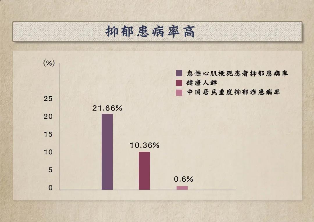 中國(guó)急性心肌梗死患者抑郁患病率為21.66%,明顯高于健康人群的10.36%。中國(guó)居民重度抑郁癥患病率為0.6%,重度抑郁癥是心臟病的危險(xiǎn)因素之一。