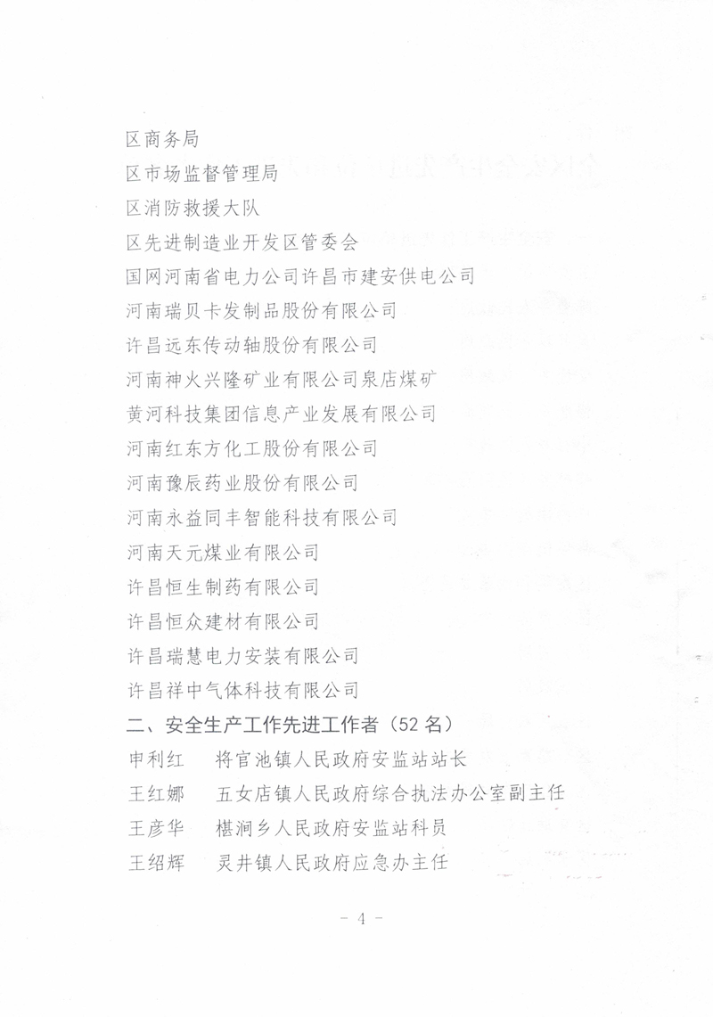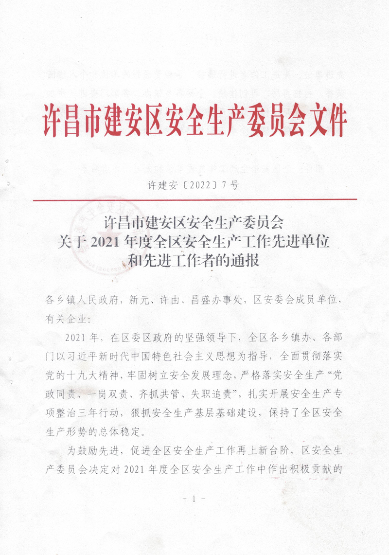 2021年,我公司以習(xí)近平新時代中國特色社會主義思想為指導(dǎo),全面貫徹落實黨的十九大精神,牢固樹立安全發(fā)展理念,嚴(yán)格落實安全生產(chǎn)“黨政同責(zé)、一崗雙責(zé)、齊抓共管、失職追責(zé)”,狠抓安全生產(chǎn)基層基礎(chǔ)建設(shè),排除潛在的安全隱患,保持了廠區(qū)安全生產(chǎn)形勢的總體穩(wěn)定。故許昌市建安區(qū)安全生產(chǎn)委員會對我公司在2021年度安全生產(chǎn)工作中的積極貢獻(xiàn)進(jìn)行了表彰,授予于“全區(qū)安全生產(chǎn)工作先進(jìn)單位”稱號。