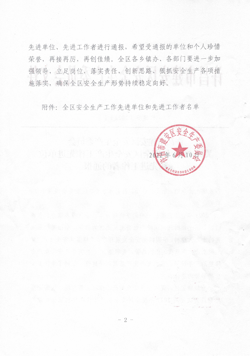 我司被評選為2021年度建安區(qū)全區(qū)安全生產(chǎn)工作先進(jìn)單位
